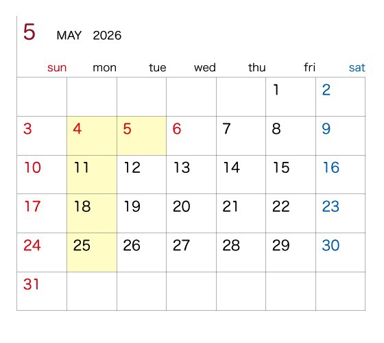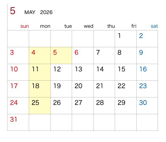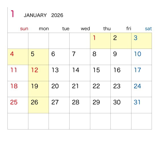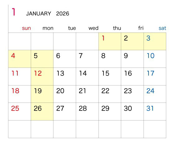 年始:1月1日より4日まで休業し、5日が月曜の場合には続けて休業を致します