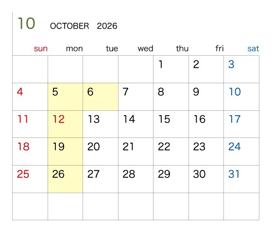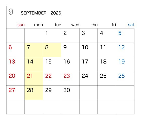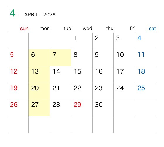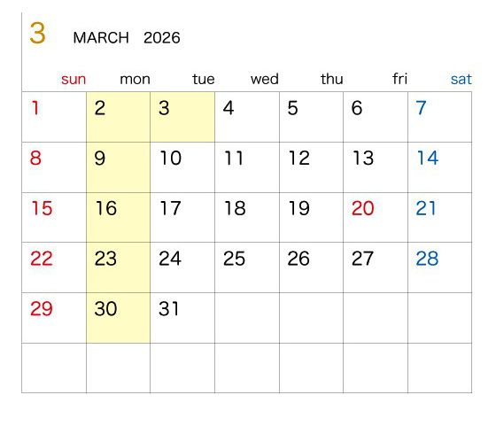 毎月:第1火曜日*1(1月は年始休業が4連休以上の場合は営業を致します)