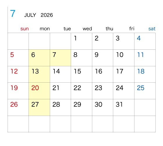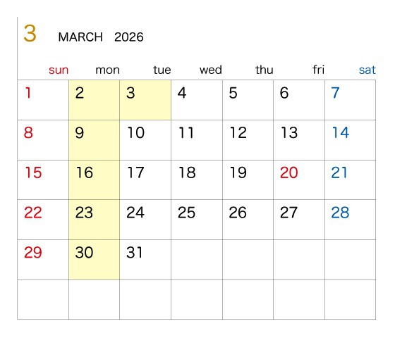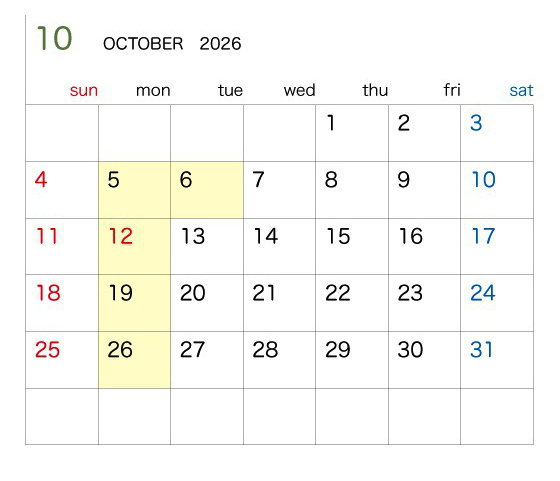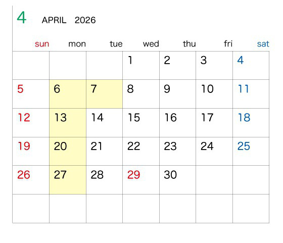毎月:第1火曜日*1(1月は年始休業が4連休以上の場合は営業を致します)