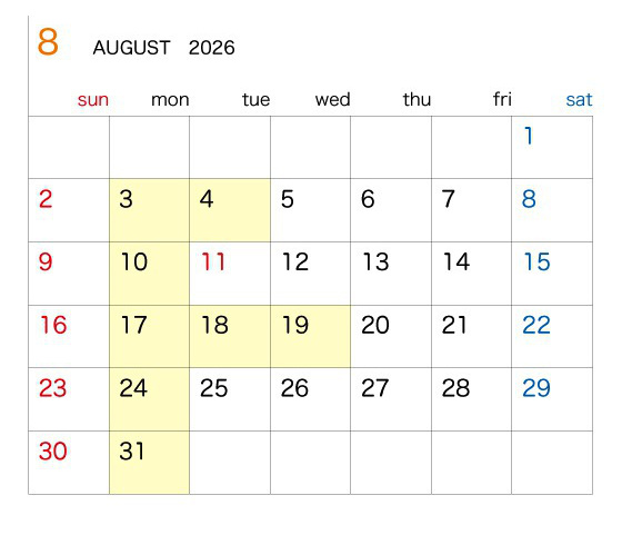 年始:1月1日より4日まで休業し、5日が月曜の場合には続けて休業を致します