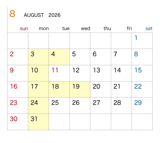 お盆:8月の第3月曜に続けて火曜と水曜で、3日間の休業を致します