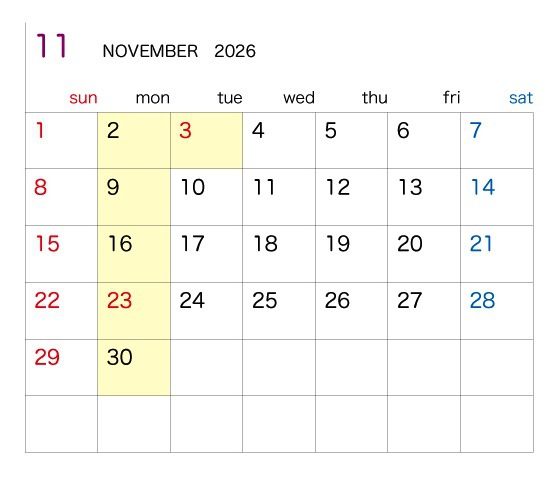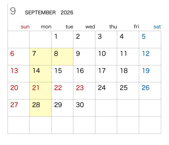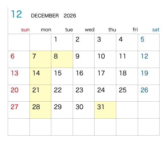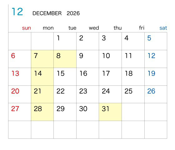 毎週:月曜日(12月は下記の年末を参照下さい)
